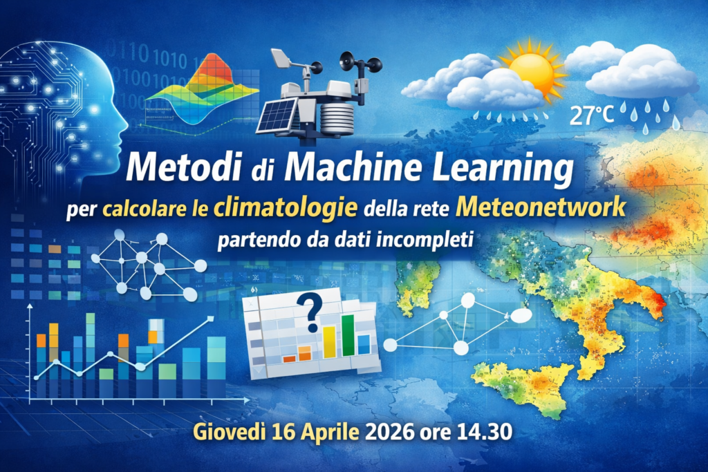 Il Centro Regionale di Formazione dell’Organizzazione Meteorologica Mondiale (WMO-RTC) in Italia ed il Consorzio LaMMA organizzano un seminario che sarà tenuto dal dott. Guido Cioni (Airbus/MeteoNetwork) giovedì 16 Aprile 2026 alle 14:30. Sarà possibile seguire gratuitamente in seminario online previa registrazione al seguente link: https://events.teams.microsoft.com/event/c1fc3b60-49f7-45c9-bdbb-cda9c8a1169e@34c64e9f-d27f-4edd-a1f0-1397f0c84f94 Metodi di Machine Learning per calcolare le climatologie della […]