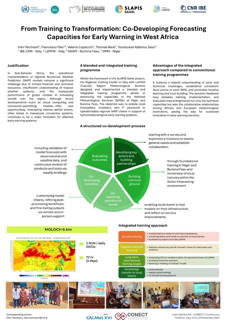 Within the framework of the SLAPIS Sahel project, a development cooperation initiative, the Regional Training Center in Italy designed and implemented a blended and integrated training programme aimed at enhancing the capacities of the National Meteorological Services (NMSs) of Niger and Burkina Faso. The objective was to enable local forecasters, modelers, and IT personnel to operationalize regional NWP chains in support of hydrometeorological early warning systems.