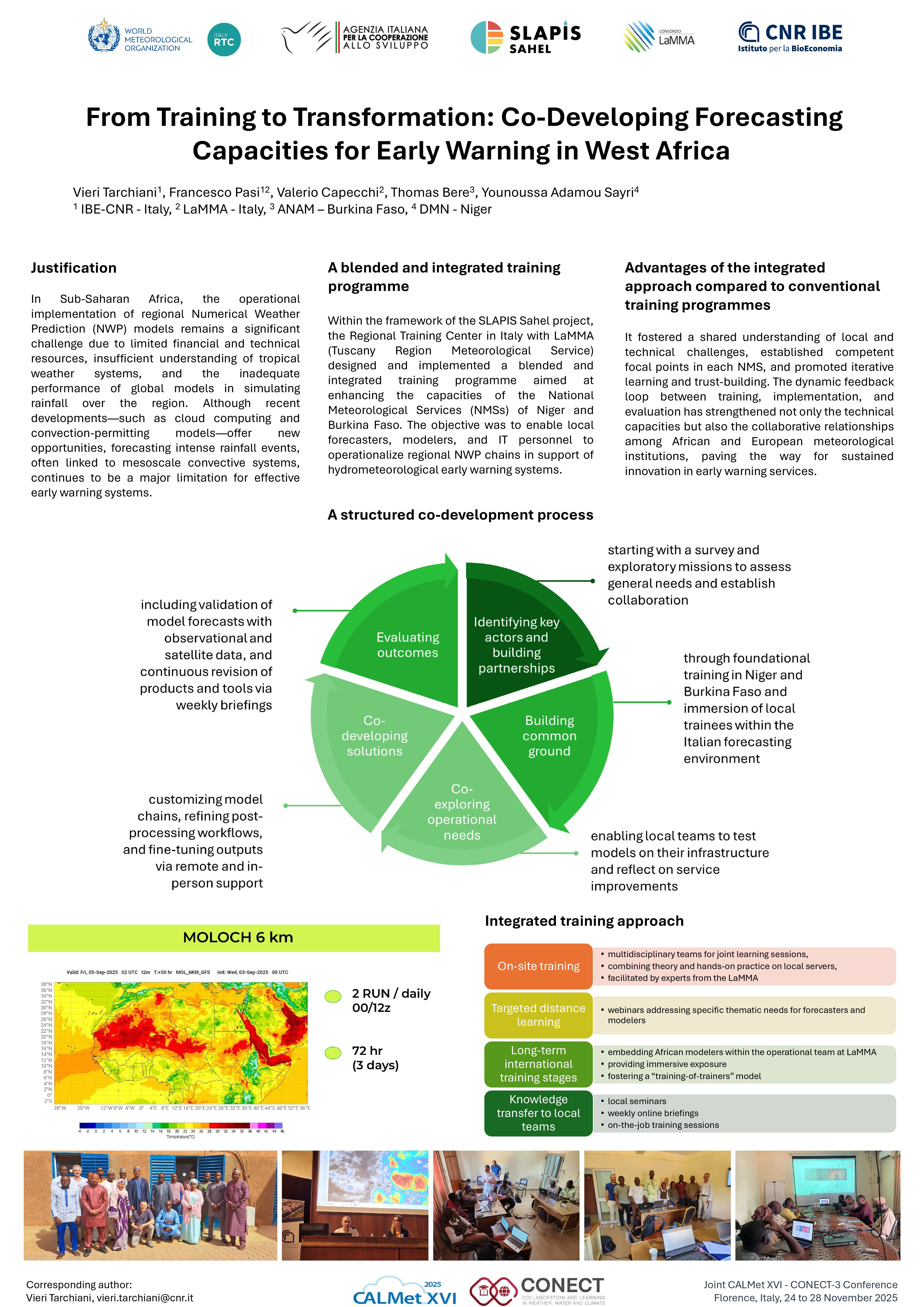 In Sub-Saharan Africa, the operational implementation of regional Numerical Weather Prediction (NWP) models remains a significant challenge due to limited financial and technical resources, insufficient understanding of tropical weather systems, and the inadequate performance of global models in simulating rainfall over the region. Although recent developments—such as cloud computing and convection-permitting models—offer new opportunities, forecasting intense rainfall events, often linked to mesoscale convective systems, continues to be a major limitation for effective early warning systems. Within the framework of the SLAPIS Sahel project, a development cooperation initiative, the Regional Training Center in Italy designed and implemented a blended and integrated training programme aimed at enhancing the capacities of the National Meteorological Services (NMSs) of Niger and Burkina Faso. The objective was to enable local forecasters, modelers, and IT personnel to operationalize regional NWP chains in support of hydrometeorological early warning systems.